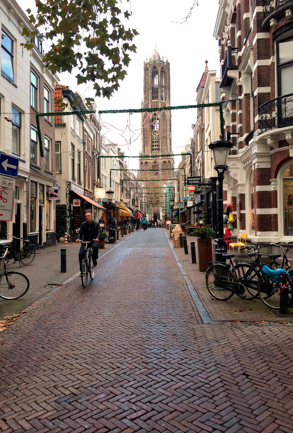 Terug in de straat: oog in oog met de Domtoren. Maar kijk niet alleen omhoog: recht onder de toren ligt een tegel met een gegraveerde kindertekening. Uiteraard loop je onder de Domtoren door, en niet eromheen. Het Domplein is het hart van de stad. Tegenwoordig kun je er ook onder. Naast de Domkerk bevindt zich een poortje naar het Pandhof, een van de mooiste binnentuinen van de stad. Naast het Pandhof staat het Academiegebouw, het ceremoniële hart van de Universiteit Utrecht. Grote kans dat je de promovendi hier zwetend ziet binnengaan.